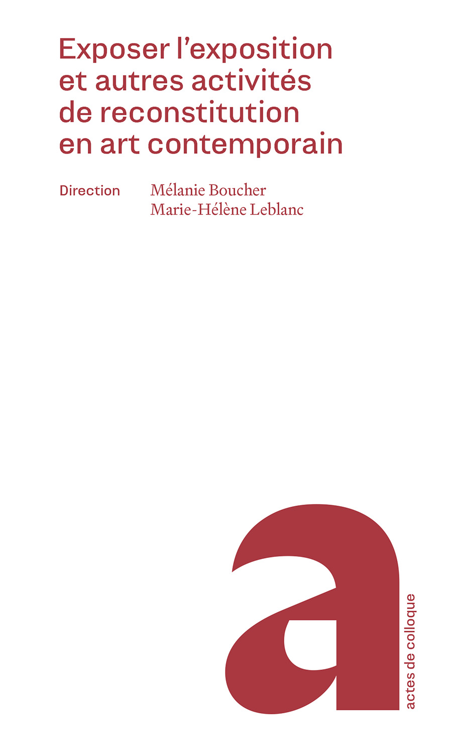 Auteurs et autrices : Sophie Bélair Clément, Vincent Bonin, Mélanie Boucher, Mathieu Copeland, Marie Fraser, Reesa Greenberg, Marie J. Jean, Safa Jomaa, Marie-Hélène Leblanc, Diana Nemiroff, Prinz Gholam, Jessica Ragazzini