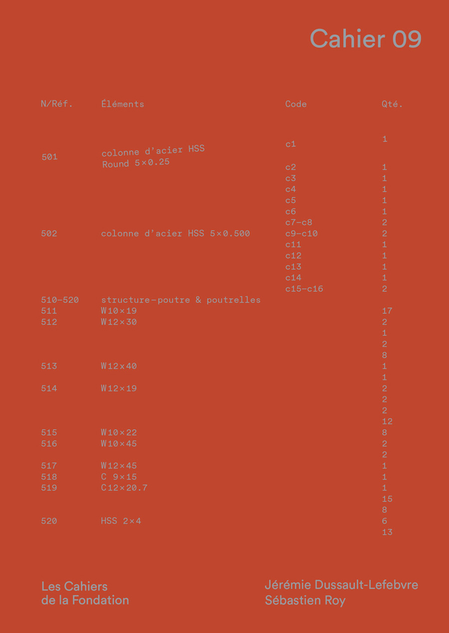 Livre d’art et d’architecture, comprenant 30 illustrations, le Cahier 09 résulte de la première résidence en architecture, réalisée par le duo Abeirst qui réunit Jérémie Dussault-Lefebvre et Sébastien Roy. Il présente un exercice audacieux qui consiste à explorer de quelle manière les matériaux qui donnent corps à la Fondation Grantham peuvent nourrir la création d’autres objets. Déconstruire pour reconstruire, voilà la méthodologie en deux temps proposée par la paire d’architectes. Elle s’amorce par un inventaire des lieux composé d’une liste d’éléments et d’une documentation photographique, puis se prolonge dans la conception d’un nouveau pavillon qui use des colonnes d’acier, poutrelles de bois, charnières et autres « ressources » recensées à la première étape. Ce réassemblage, que l’on voit naître dans les pages du Cahier sous la forme d’une maquette virtuelle, n’est bien sûr qu’une possibilité parmi d’autres de tout ce qui pourrait être rêvé et érigé à partir de l’inventaire initial.